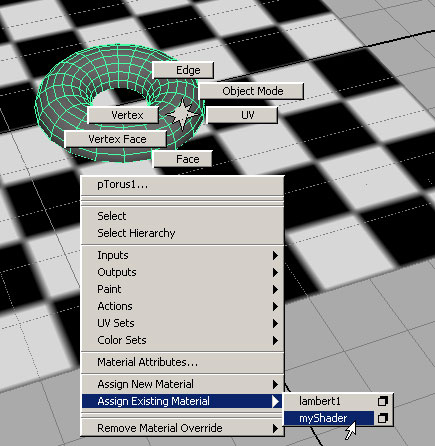 Create a ground plane and a poly Torus from the "Create Polygon Primitives" menu. To assign the new shader to both of them, select each one and hold down the right mouse button .You'll see a pop-up menu that will provide options to set an existing material. |