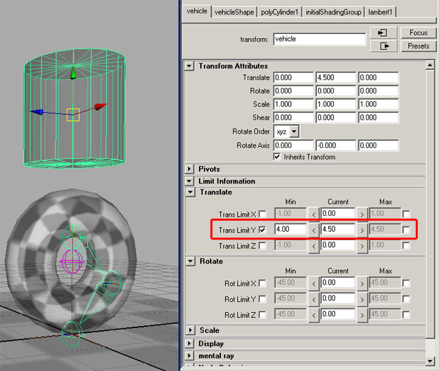 At this point, our rig is already functional. We just need to attach some geometry to show off our work. Make a poly cylinder for our vehicle. Raise it 4.5 units off the grid in translate y. To make sure that it can't crush our wheel, let's set limits on its translate values. You can do this in the attribute editor (ctrl+a). |