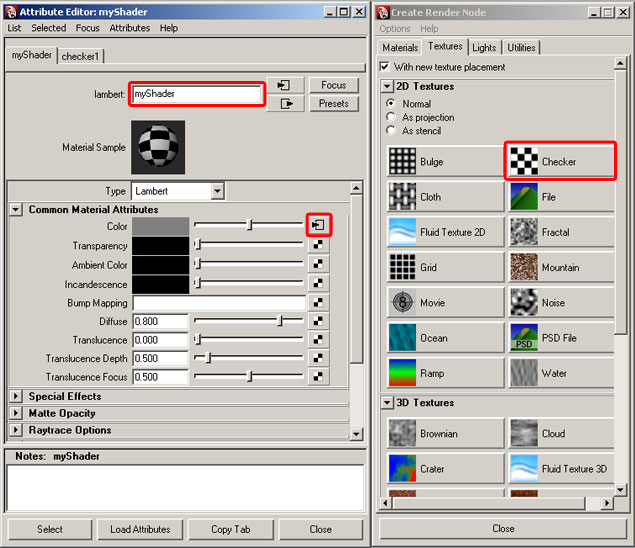 Create a new Lambert shader by choosing "Lambert" from the menu on the left and name it myShader. Set the color to checker pattern by hitting ctrl+a and then selecting a new node for color. When the "Create Render Node" options come up, pick "Checker". You can rename your shader here too. |