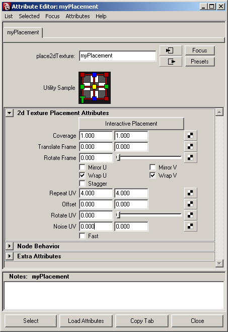 | Now lets have some fun with our creation. Remember that shader we made earlier? Let's go back to that in the hypershade. Select myShader and click the connections button at the top of the hypershade. You'll see a chain of nodes in the bottom window. Double click on the left-most one and rename it "myPlacement". This node is responsible for the placement of the checkers in our scene. Take a moment to play with some of the attributes like "Repeat UV", "Rotate UV", and the one we'll be using - offset. | |