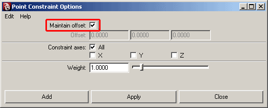 Now, using a normal point constraint (default settings), we'll constrain the handle to the ground plane. We also want to constrain our axle joint to our IK chain, but this constraint is unique. Select the bottom joint in our IK chain and then select our axle joint. Now open the options for our point constraint (the little box next to the point constraint in the menu) and make sure that "Maintain Offset" is checked. Point constrain the joint in the center of our "wheel" in only the Y axis and make sure the "maintain offset" checkbox is checked. This will keep our axle off the ground, yet hold our IK joint and axle joints together. |