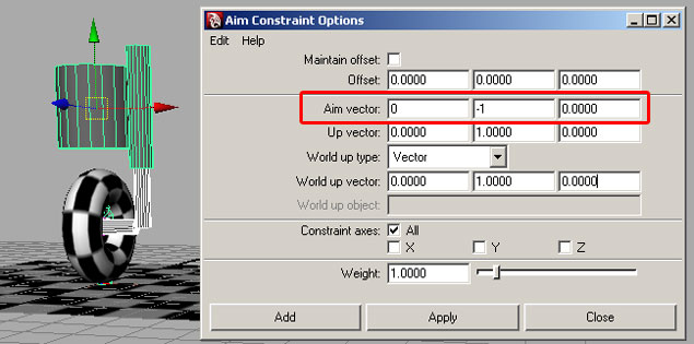 | This is where it gets interesting. We'll use aim constraints to keep the cylinders pointing at each other. Select the top shock, and then shift select the lower cylinder. Select "Aim" from the "Constraint" menu and use default settings. Now select our axle cylinder and shift select the "vehicle" geometry. For this aim constraint we'll need to change the default settings. Make sure to open the options and set up the aim vector like this: | |