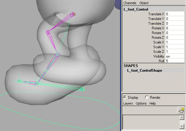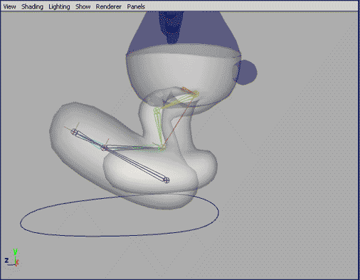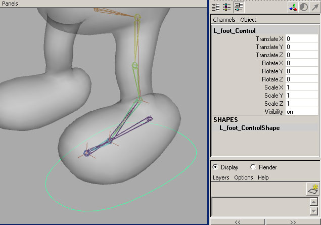 Now if we throw some quick binding on the geometry, this new leg can take on a little life. Select the "pelvis" and the "geometry" nodes and smooth bind to the joint hierarchy. Bind everything above the hip area of the geometry 100% to the "pelvis". Now when you move the "Reverse_foot" bone around, you should see some very human-like motion in the leg. To really expose the power of this setup, lets add a controller. A quick way to make one is to create a NurbsPrimatives>Circle from the Create menu in Maya. Move the circle under the foot and scale it to size. If you hit F9 you'll be able to shape the circle more like a foot. Hit F8 to return to normal functionality. Once you've made the controller, name it and freeze transforms from the modify menu. Edit>delete by type>history should also be run at this point. |