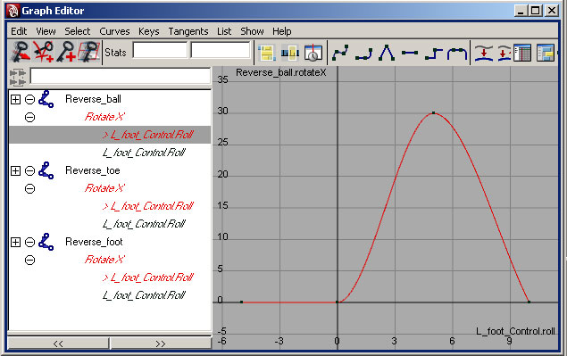 Some things to point out here - The "Reverse_*" bones in our rig are part of the controls. They could have been any objects in a hierarchy, but they are easier to manipulate as bones. It's important to keep these bones separate from the regular skeleton though, and they should never have any binding data. Now that we've connected them to the "L_foot_control" with set-driven-key, they have animation curves attached to them. You can edit how the "roll" attribute we made affects these joints in the Graph Editor, much like you edit any other type of animation.