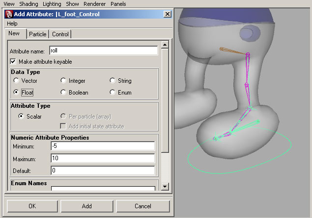 | Now with your "Reverse_foot" bone selected, shift+select the new control. Hit "p" on the keyboard to re-parent the foot control bones under the controller. Now we'll need a custom attribute for controlling multiple bones. I usually name this attribute "roll" because I use it to roll the character's foot up onto it's toes. You'll find the add attribute options under the Modify menu in Maya. We'll need min and max values of -5 and 10 respectively. |