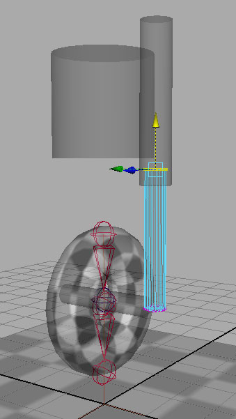 Now select the top joint in our IK chain, shift select our "vehicle" and hit the "p" key. This makes the IK chain a child of the vehicle. At this point you should be able to move the vehicle up and down to see the effects of our rigging. But we're not done yet. Let's make a cylinder and turn it sideways in the center of our "wheel". make it a child of the axle joint. Scale it to fit nicely and freeze its transforms. Forgetting this step will make things weird later. I find the values in the picture below to work pretty well, but precision isn't necessary. |