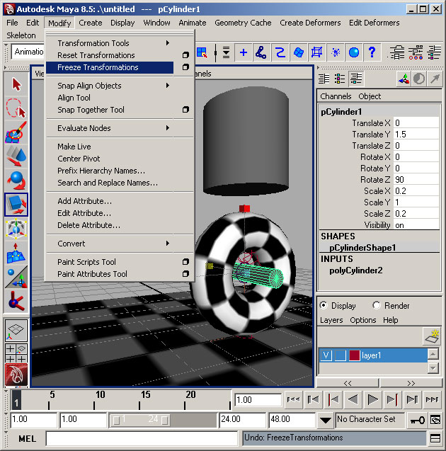 Rename the poly Torus "Wheel" and turn it on it's side. Its ideal attributes are 0, 1.5, 0 for translate values and 0, 0, 90 for rotation. Place a joint in the center (same translate attributes) and make the Torus a child of the joint. This will be our point of rotation for the wheel. Rename the joint "axle" so we can find it later. |