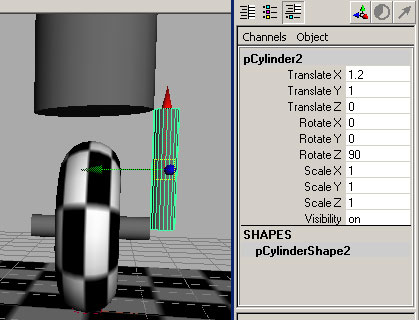 | Now we need our "shocks". The easiest way to make them is by making duplicates of our axle cylinder. With the cylinder selected, hit ctrl+d and make the new duplicate a child of the original. Turn the new cylinder upright and move it to the end of our "axle". Don't freeze the transforms on this one. It should look like this: | |