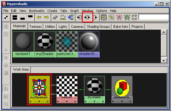 | Now lets have some fun with our creation. Remember that shader we made earlier? Let's go back to that in the hypershade. Select myShader and click the connections button at the top of the hypershade. You'll see a chain of nodes in the bottom window. Double click on the left-most one and rename it "myPlacement". This node is responsible for the placement of the checkers in our scene. Take a moment to play with some of the attributes like "Repeat UV", "Rotate UV", and the one we'll be using - offset. | |
