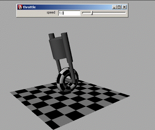 | if(!`window -q -exists throttle`) {window -title "throttle" throttle; columnLayout; floatSliderGrp -label "speed" -min 0 -max 5 -v 1 -field true speedCtrl; showWindow throttle;} float $speed = `floatSliderGrp -q -v speedCtrl`; vehicle.translateY = cos(time*5) + 5; vehicle.translateZ = sin(time*5); vehicle.translateX = 0; myPlacement.offsetU = time*$speed; |