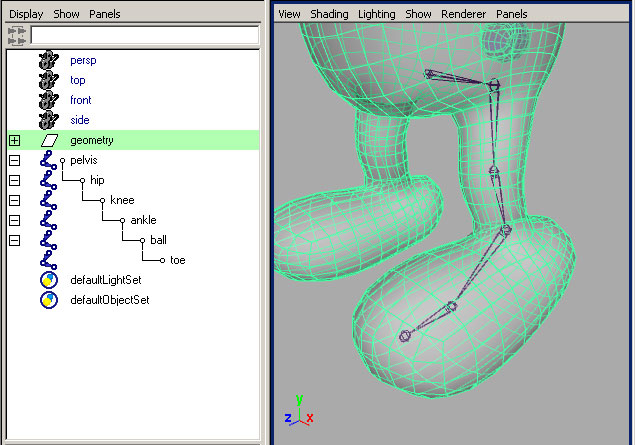 Now we need to add IK. From the "skeleton" menu in Maya, chose the IK handle tool. With this tool active, pick the "hip" bone and then the "ankle" bone in the viewport. Re-activate the tool hitting the recent tool icon |