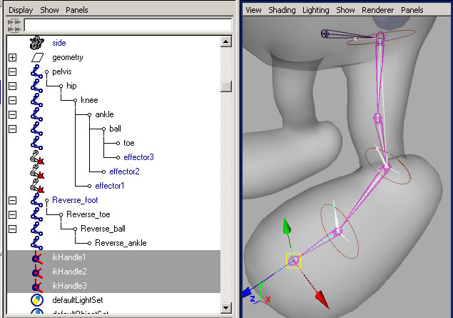 This next step is what gives the "Reverse_foot" all the power. Move the new ikHandles into the "reverse" hierarchy as shown below. The handle on the ankle goes under the "Reverse_ankle" bone. The one on the ball goes under the "Reverse_ball" and the last one is for the "Reverse_toe". |
