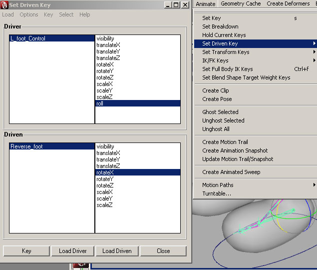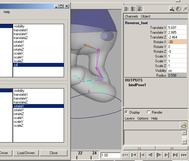 | There are many ways to have the custom attribute manipulate the foot the way I want, but the fastest might be with set-driven-key. The tool is located under the Animate menu in Maya. Select the new attribute as your driver, and the rotateX attribute on the "Reverse_foot" bone to be driven. Press "Key". Load the "Reverse_toe" and "Reverse_ball" and set keys on both of their rotateX attributes as well. |